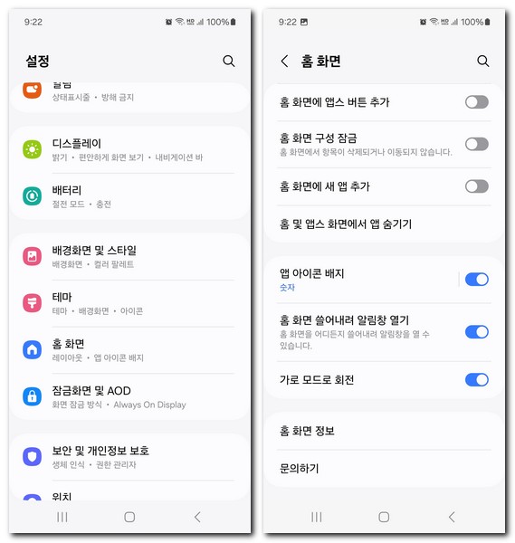 홈 화면의 아이콘이나 기본적인 화면 전체가 세로 모드로 고정되어 있는 것을 가로모드로 정렬되고 변경될 수 있도록 설정해 주는 것이 홈 화면 가로모드 회전 기능이 있습니다. 이 기능을 활성화해야만 가로모드가 정상적으로 작동 됩니다.
